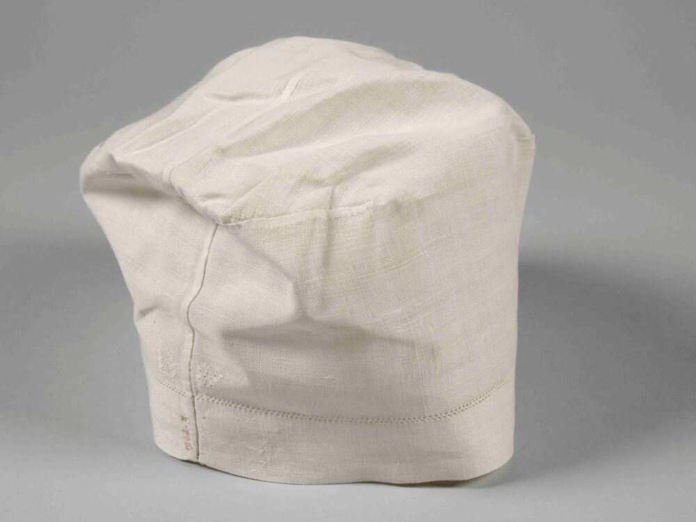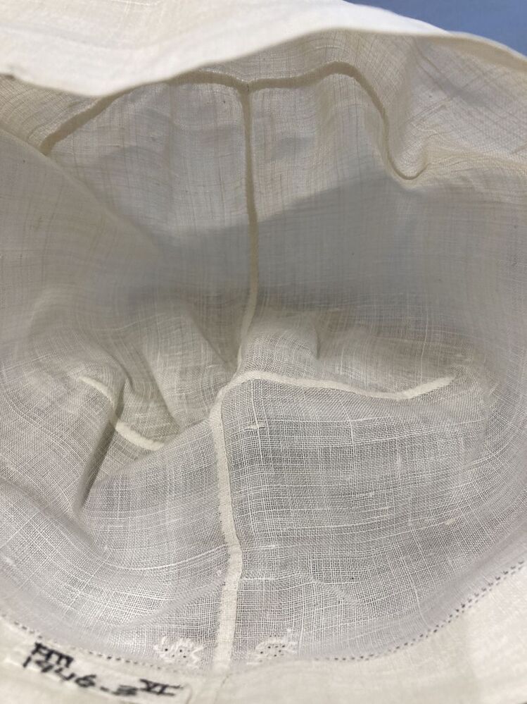 Wit linnen muts, bestaande uit 1 deel met letters in wit werk: B K, onderdeel van volledig 39-delig Hindelooper vrouwenkostuum