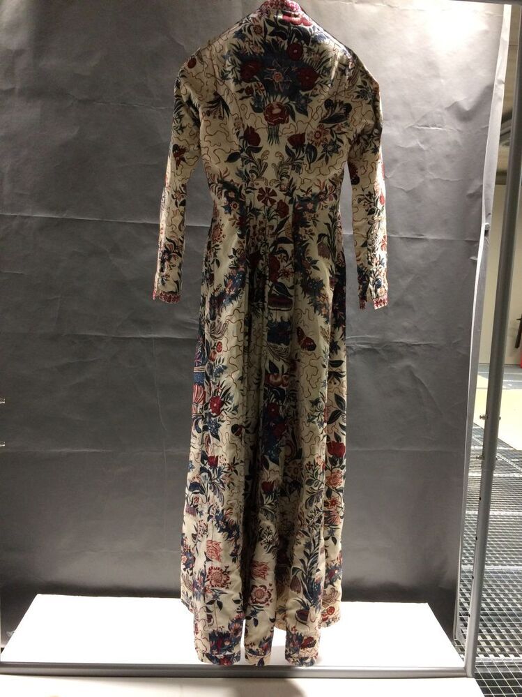 Sitsen Hindeloper wentke, vrouwenjas, met grondjes en boeketten tussen bloemslingers op witte grond, onderdeel van volledig 39-delig Hindelooper vrouwenkostuum