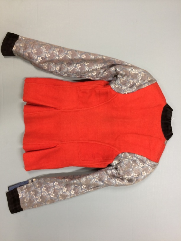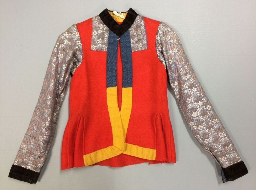 Onderst oerlijf van rood baai met blauwe zijden mouwen en frontje, onderdeel van volledig 39-delig Hindelooper vrouwenkostuum