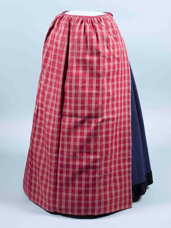 Schort van staal tommede rood bont met witte ruiten, gemerkt I.A., onderdeel van volledig 39-delig Hindelooper vrouwenkostuum