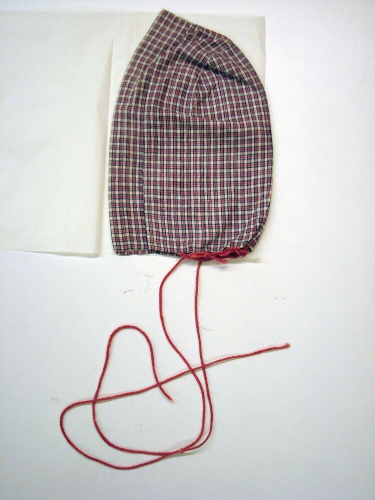 Hindelooper ondermuts voor ongehuwde vrouw, van bont katoen, zgn. pauwsfeereke, wit, blauw en rood, onderdeel van volledig 39-delig Hindelooper vrouwenkostuum