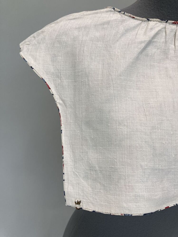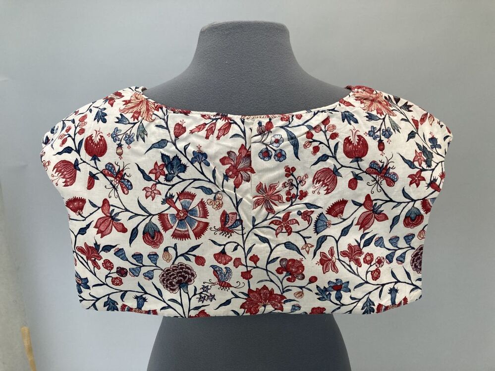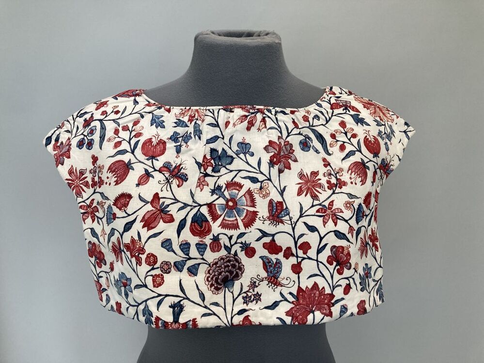 Sitsen vrouwenkroplap ofwel onderst, met slingerende takken met bloemen en insecten op witte grond