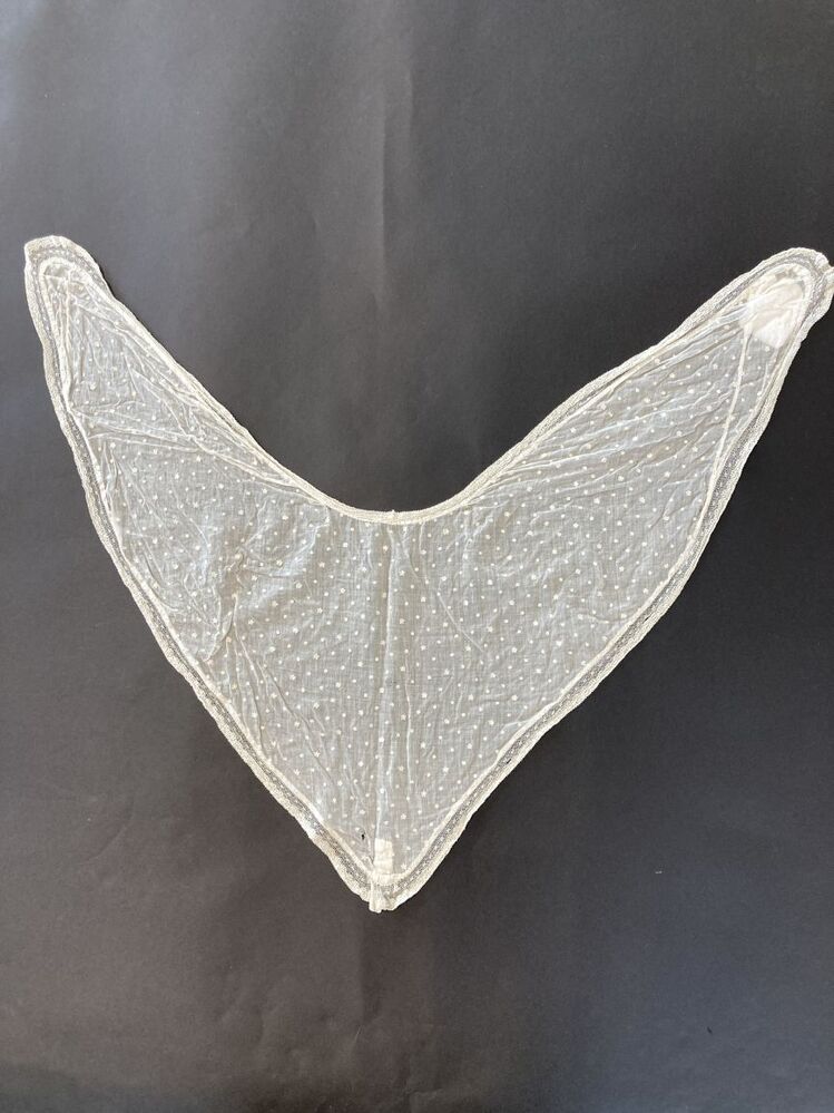 V-vormige tipdoek van witte neteldoek getamboureerd met stipjes en bloempjes, omzoomd met kantje