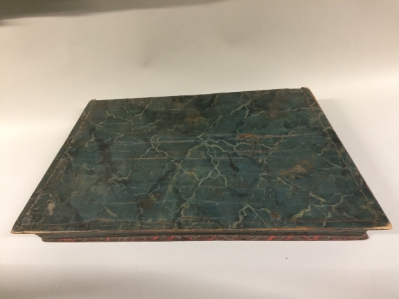 Trapeziumvormig Hindelooper kistje van vurenhout, blauw-wit gemarmerd, dient voor opbergen van de zonnedoek