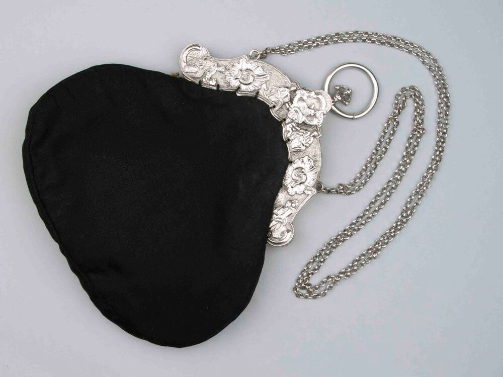 Beugeltas met haak waarop zittende vrouw met een boog in hand, en hond die tegen haar opspringt