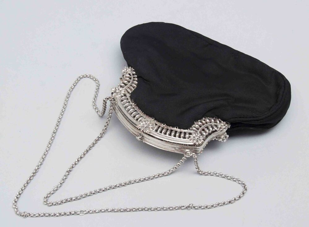 Beugeltas met aan de beugel driehoekige tas van zwarte ottomanzijde en van binnen gevoerd met grijze zij