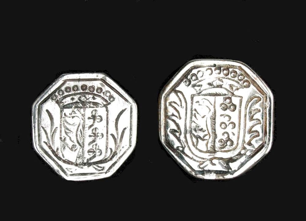 Twee verschillende platte achthoekige knopen met achterop een oogje, voorop de knopen een gegreveerd wapen