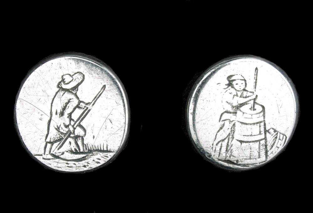 Twee platte ronde knopen met achterop een oogje, op de voorkant van de knoop respectievelijk een karnende vrouw en maaiende boer