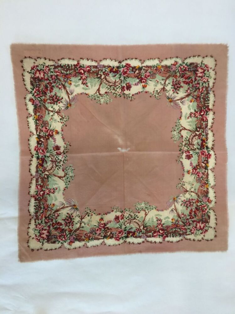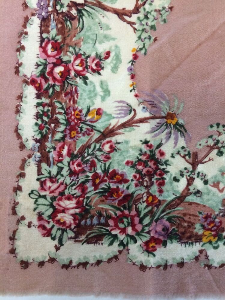 Vierkant wollen doekje in grijsbruin fond met gedrukte bloemenrand in rood, groen, geel en paars