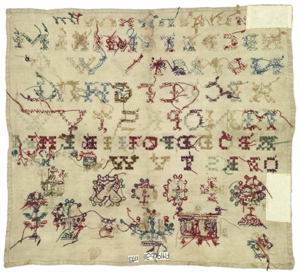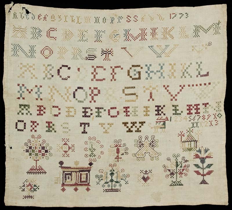 Lettermerklap met vier alfabetten, gemerkt B.A., 1773