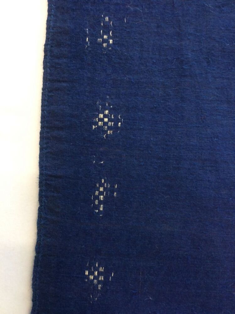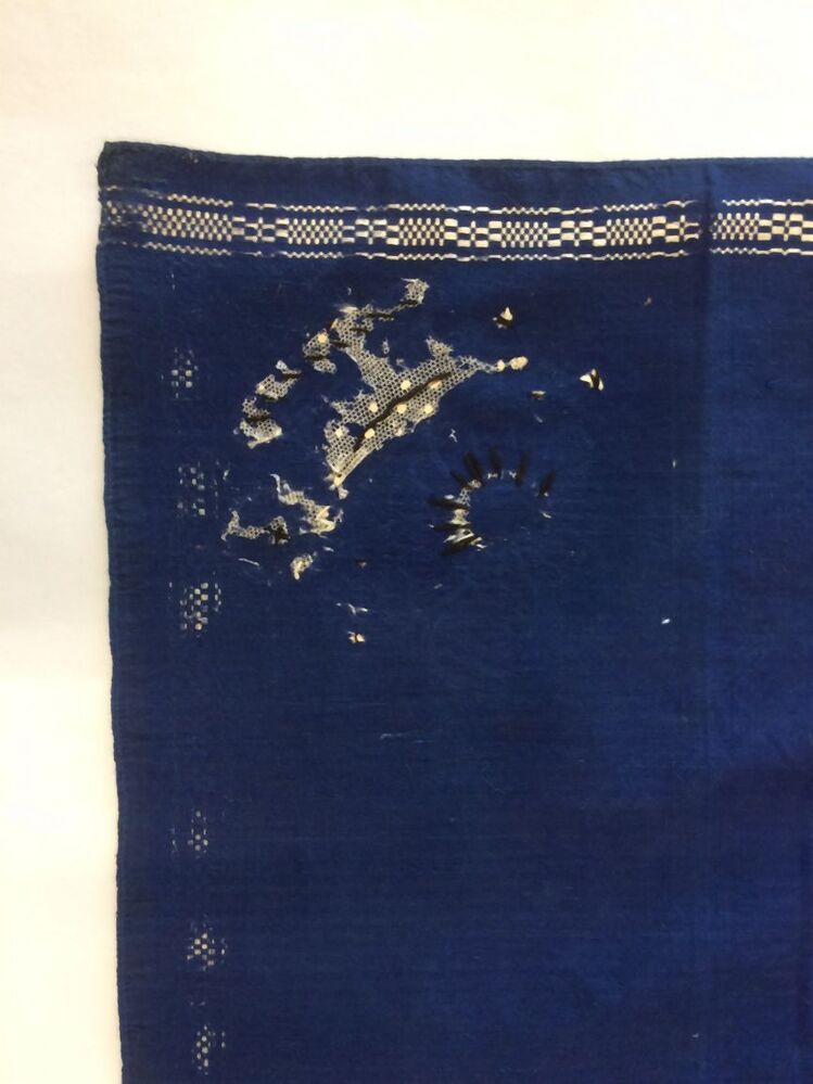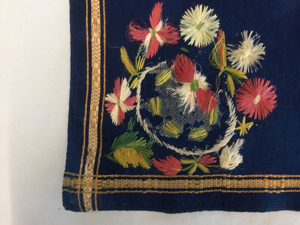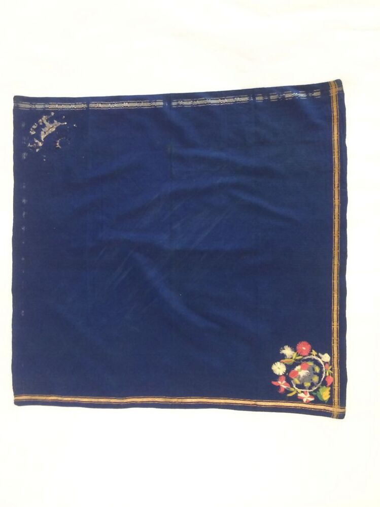 Zijden sjaal met een fond van donkerblauw, met twee geborduurde florale hoekmotieven diagonaal tegenover elkaar, voor in en uit de rouw