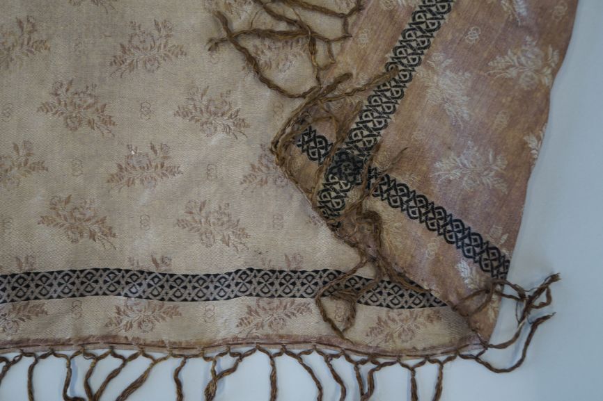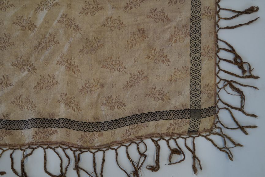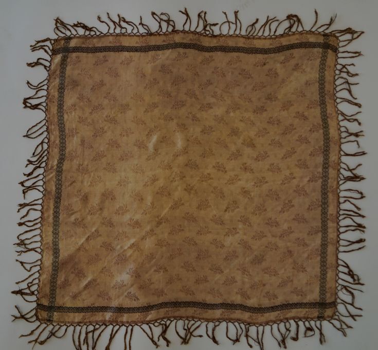 Zijden sjaaltje in met ingeweven bloemtakjes in bruin, glanzend crème en zwart