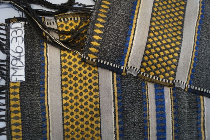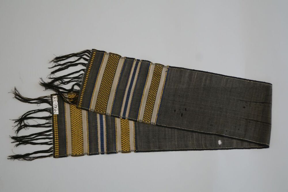 Gemeleerde zijden sjaal met ingeweven randen in oker en blauw