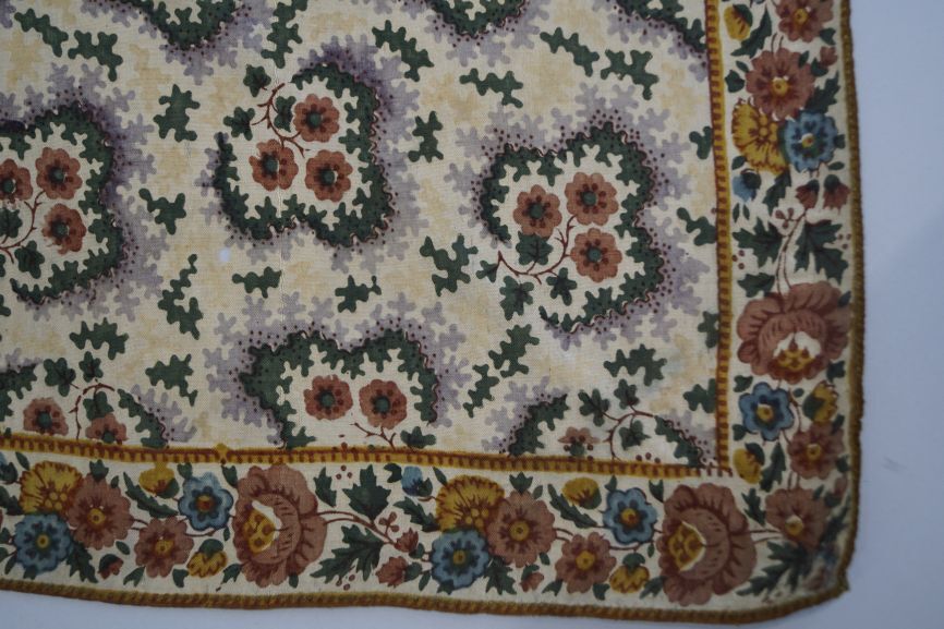 Zijden driekante sjaal, creme ondergrond, bedrukt met groene grillige motieven waarin bloempjes