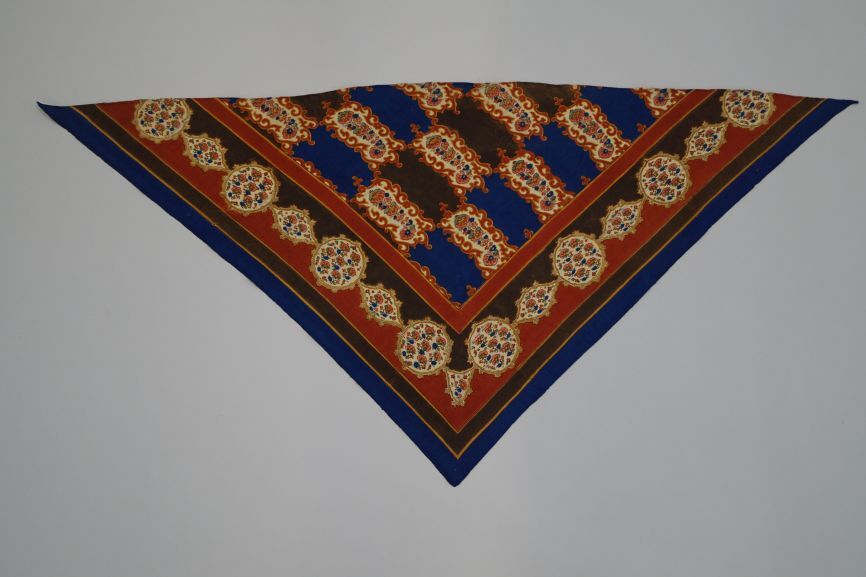 Zijden sjaal met bruine en blauwe rechthoekige vlakken en rand met ronde en ovale cartouches met bloemen