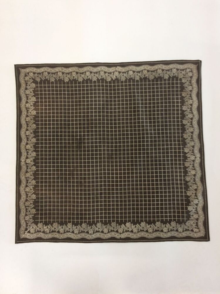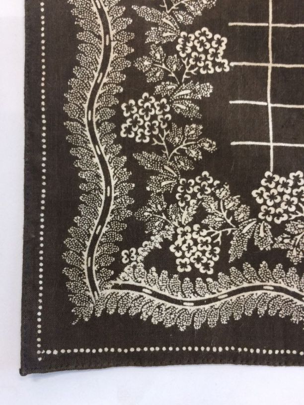 Vierkante bedrukte katoenen zakdoek met uitgespaarde ruitjes en bloemenrand op donkerbruine grond