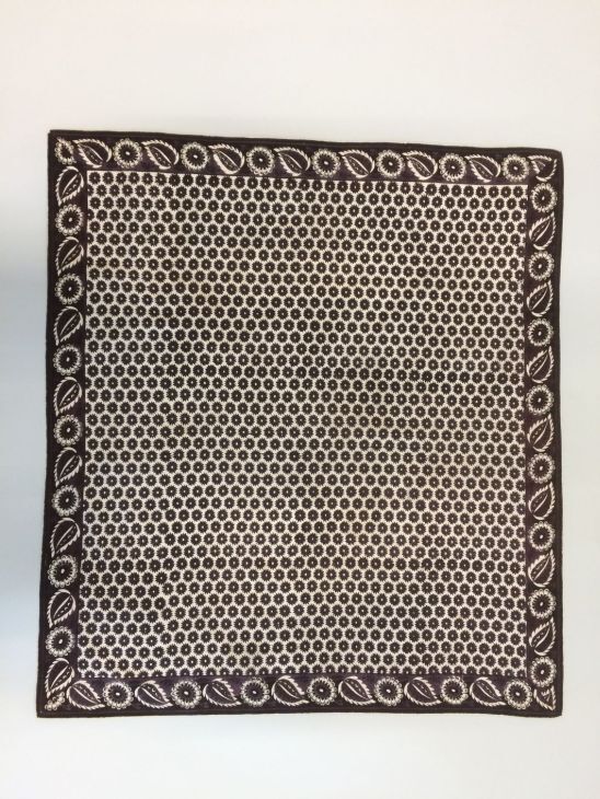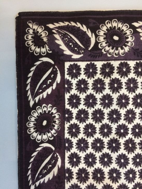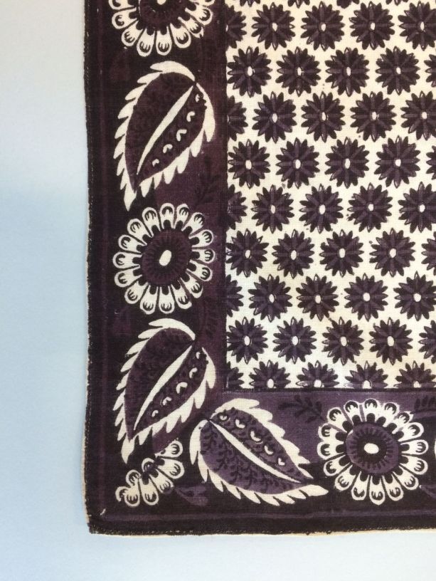 Vierkante paars bedrukte katoenen doek of sjaal met gebloemde rand en middenveld met dicht opeen gestileerde bloemen met 16 punten