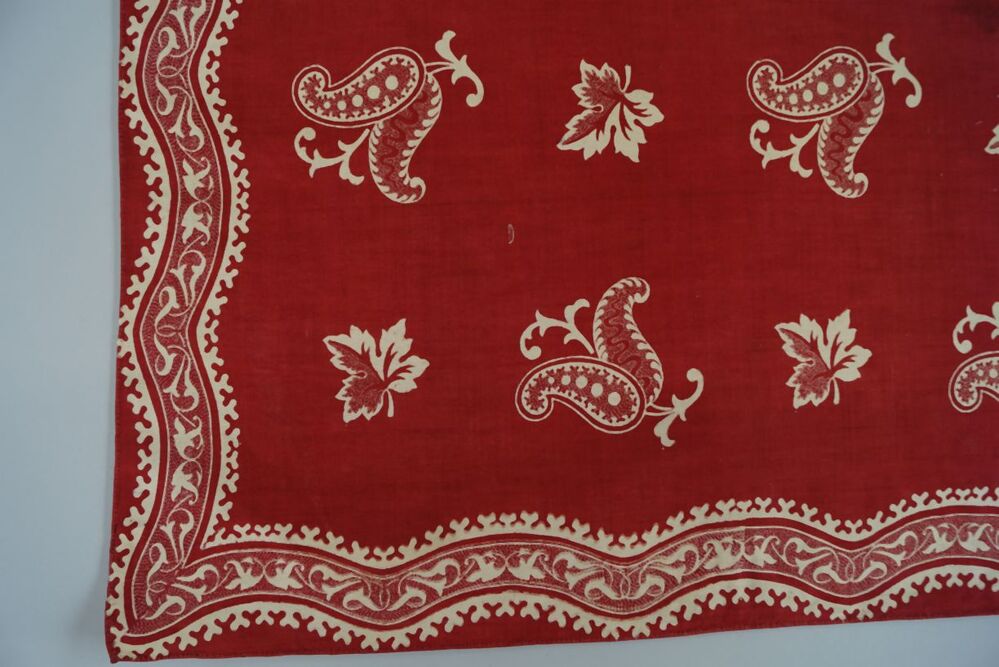 Karmijnrode vierkante bedrukte katoenen doek of sjaal met witte golvende rand en grote florale strooimotieven in reservedruk