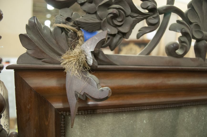 Haardscherm van mahoniehout, middenstuk voorzien van borduurwerk in wol, kruissteek, voorstellende een landschap met vrouw, jongen en hond, omgeven door wit kralen borduurwerk, alles achter glas