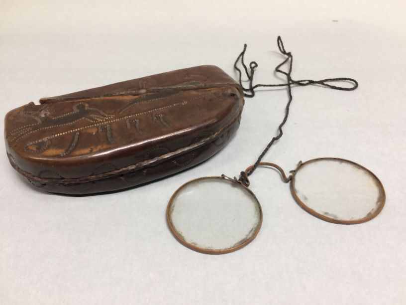 Leren brillenkoker met in het leer een haas, die achtervolgd wordt door een hond, houten binnenzijde waarin lorgnet