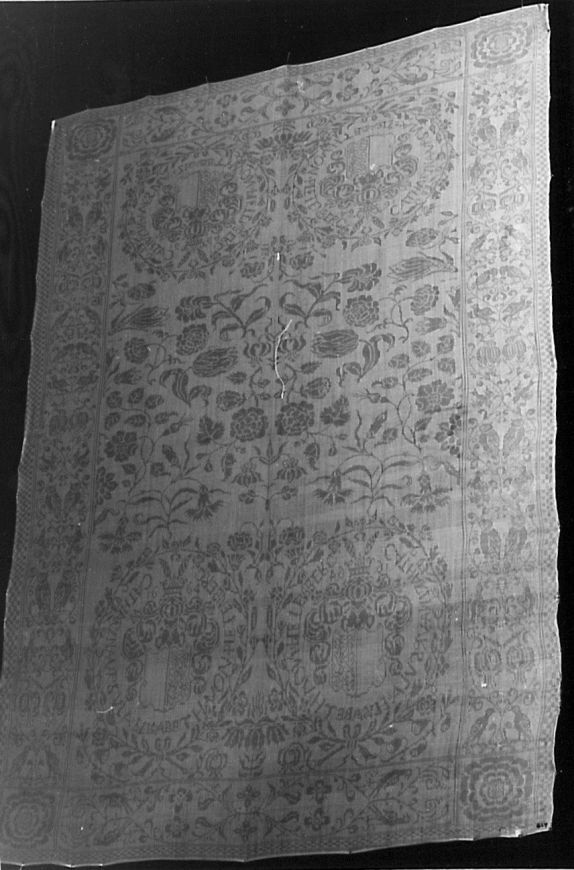 Servet van wit linnen damast met spiegelend patroon van gestrooide bloemen, wapen en naaminweving Catharina Ursula Elisabeth von Plettenberg 1664