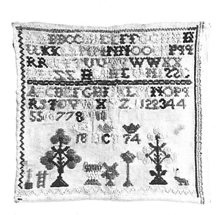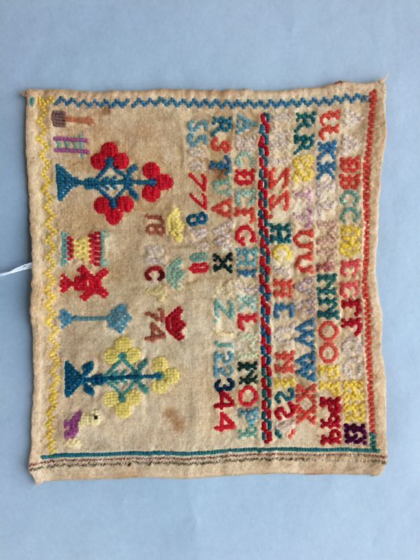 Letterlap met wollen borduurwerk, in het midden onder andere de gekroonde initialen HCT en jaartal 1874