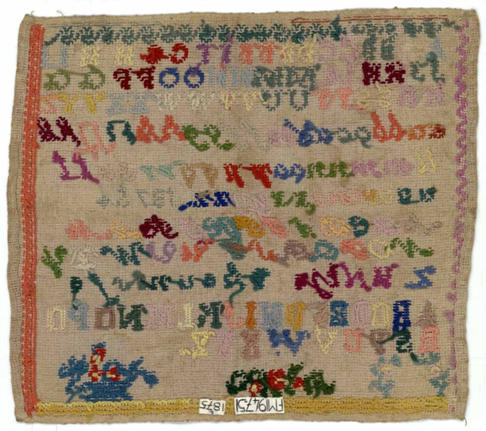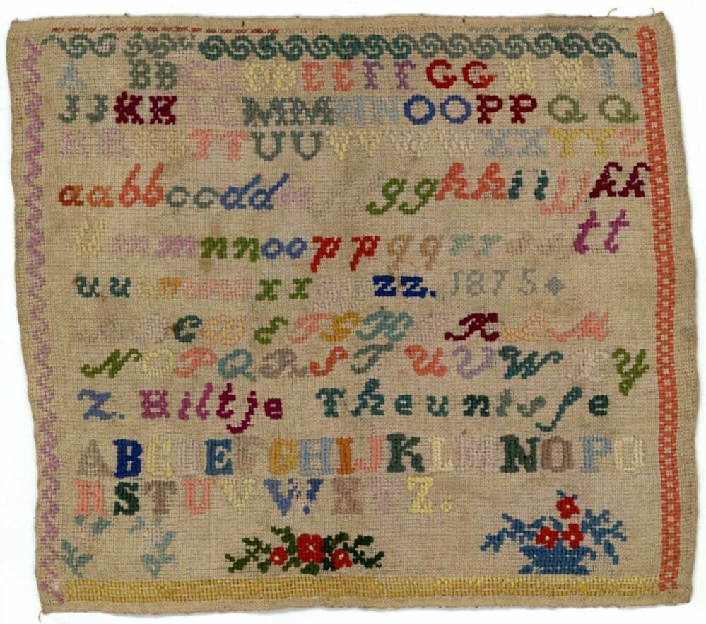 Lettermerklap, veelkleurig met wol, gemerkt Hiltje Theunisse 1875