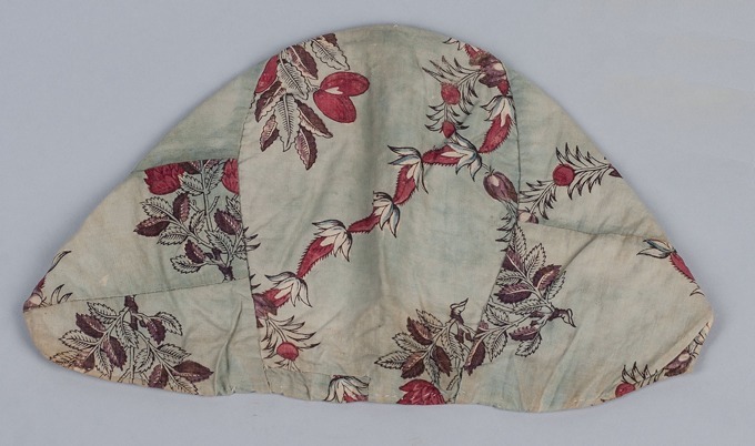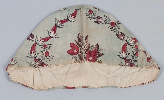 Bedrukt katoenen vrouwenmuts, slingerende banden en takjes met noten op lichtblauwe grond