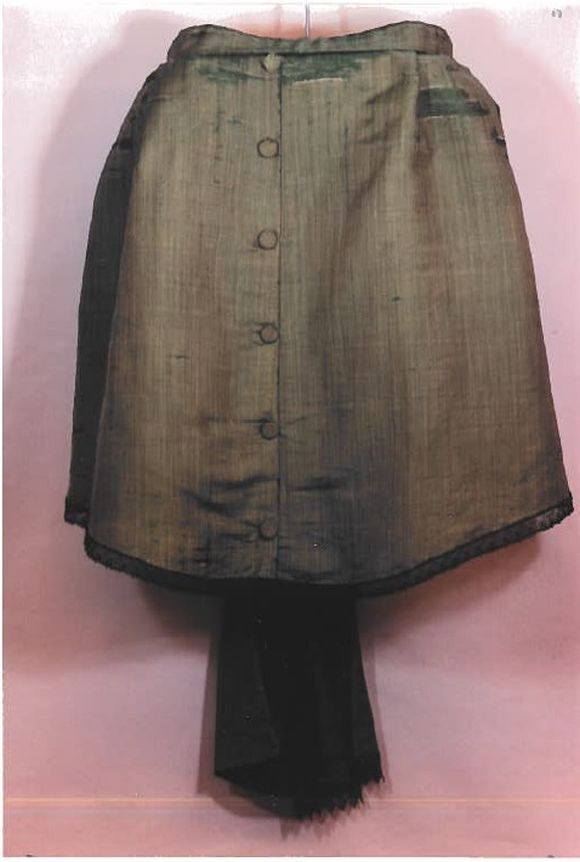 Korte overrok van groene changeantstof, geplooid aan tailleband, afgezte met zwart kant met gedrapeerde strik midden achter behorend bij jurk