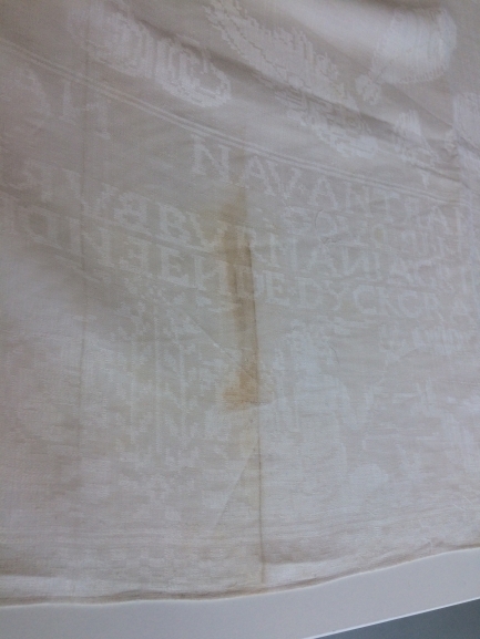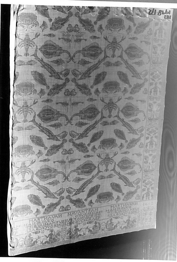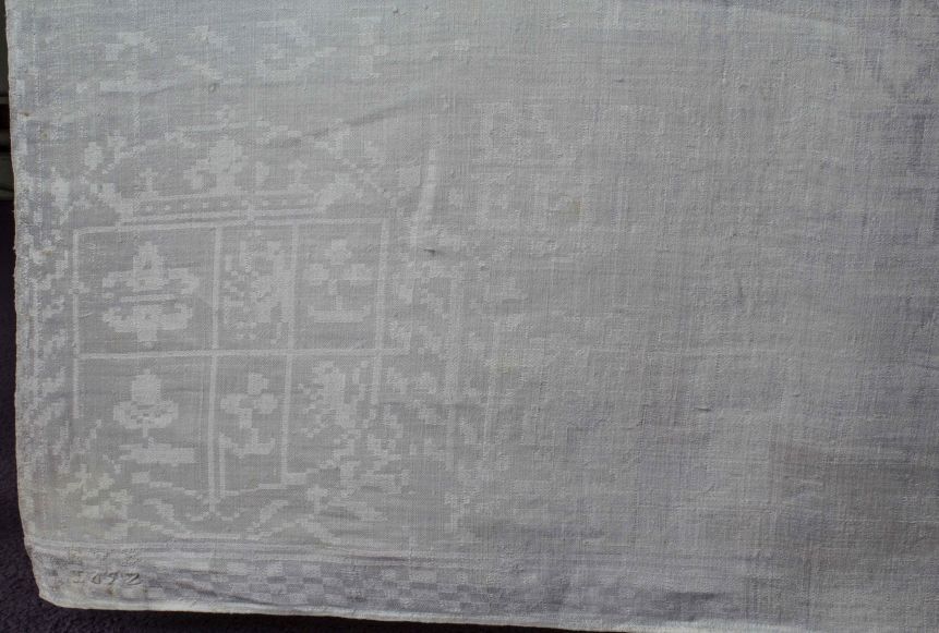 Damast tafellaken, in het midden vissenpatroon, de lange randen vertonen scheepjes, visser en vissen