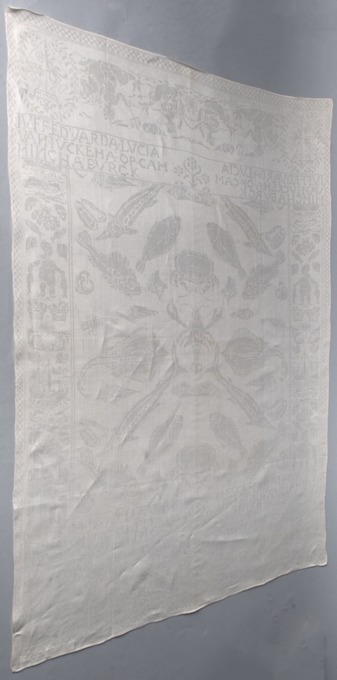 Servet van wit linnen damast met spiegelend patroon van poseidon met drietand en zeedieren, wapen en naaminweving, onderdeel van groep van achttien