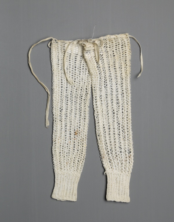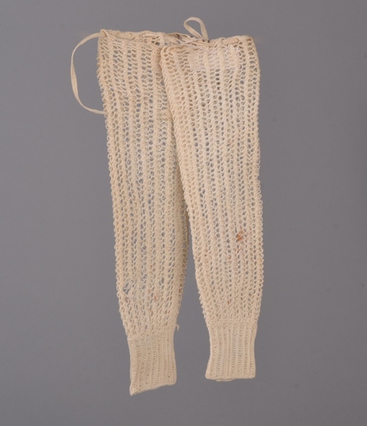 Paar wit gehaakte katoenen mouwtjes, behorend bij stel poppen- of kinderkleding