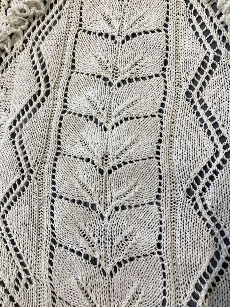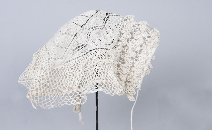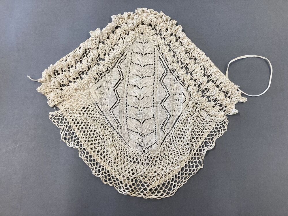 Witte gebreide morgenmuts met in midden bladertak en hanekam langs het gezicht.