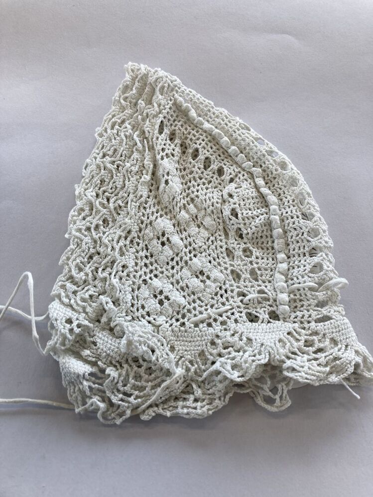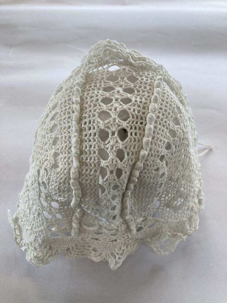 Wit katoenen gehaakte meisjesmuts met noppenranden en vijf stroken langs het gezicht.