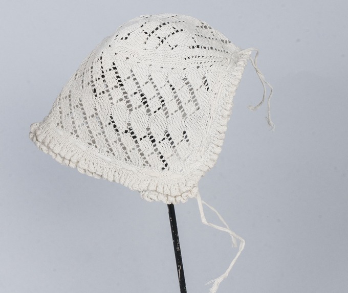 Mutsje van wit katoen, ajour gebreid met gerimpelde stroken