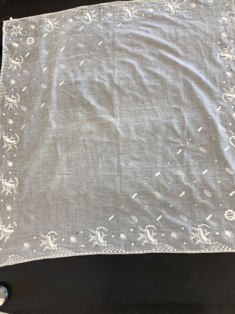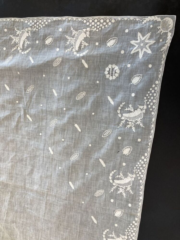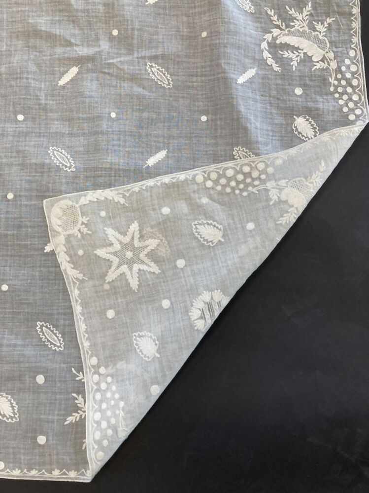 Omslagdoek van neteldoek met bloemen en bladen in tamboureerwerk