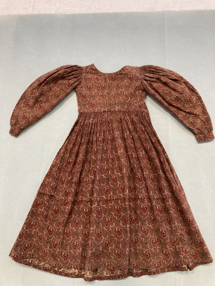 Kinderjurkje met schapeboutmouwen van bruin bedrukte katoen