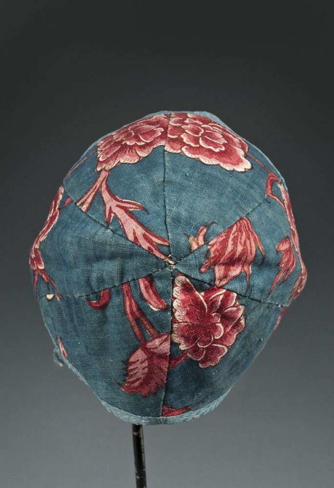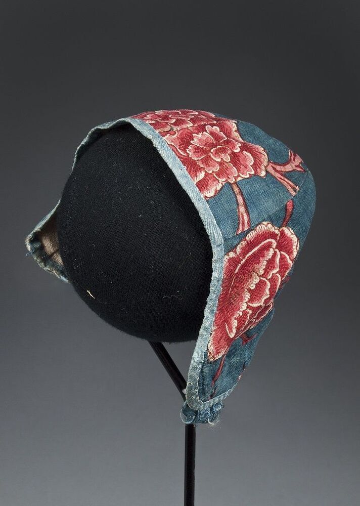 Sitsen jongensmuts, met rode rozen op blauwe grond, afgebiesd met blauwe zijde