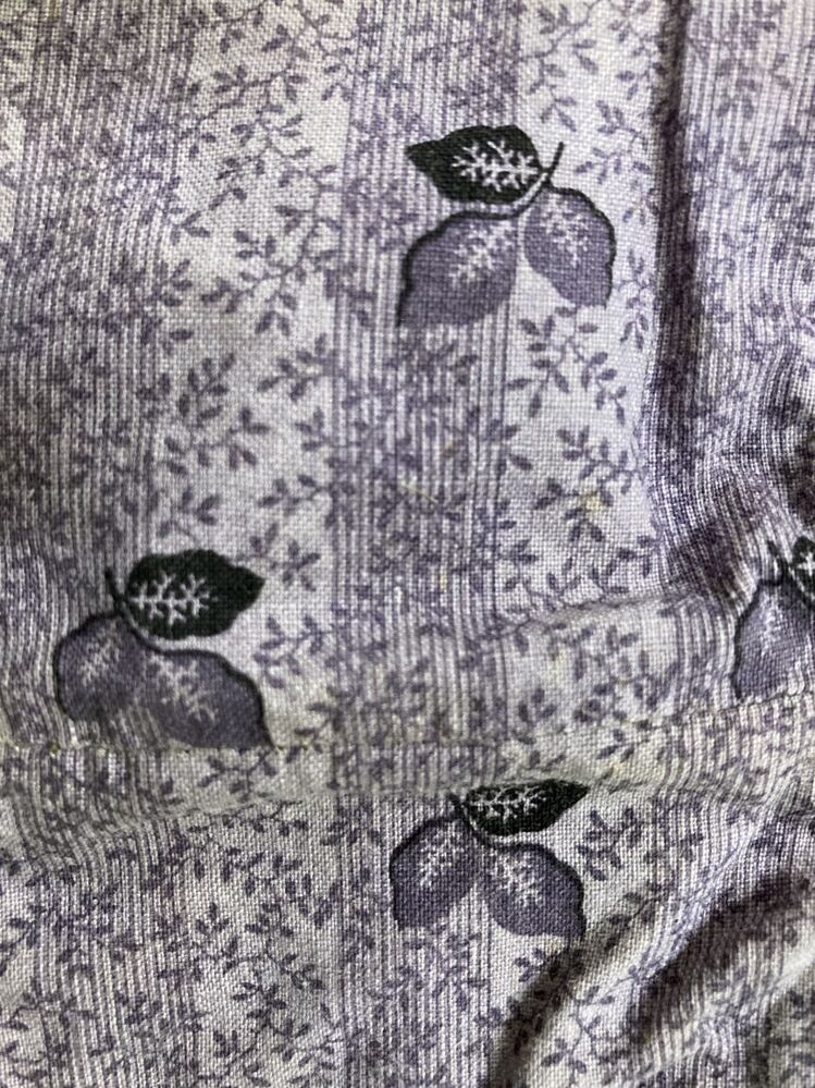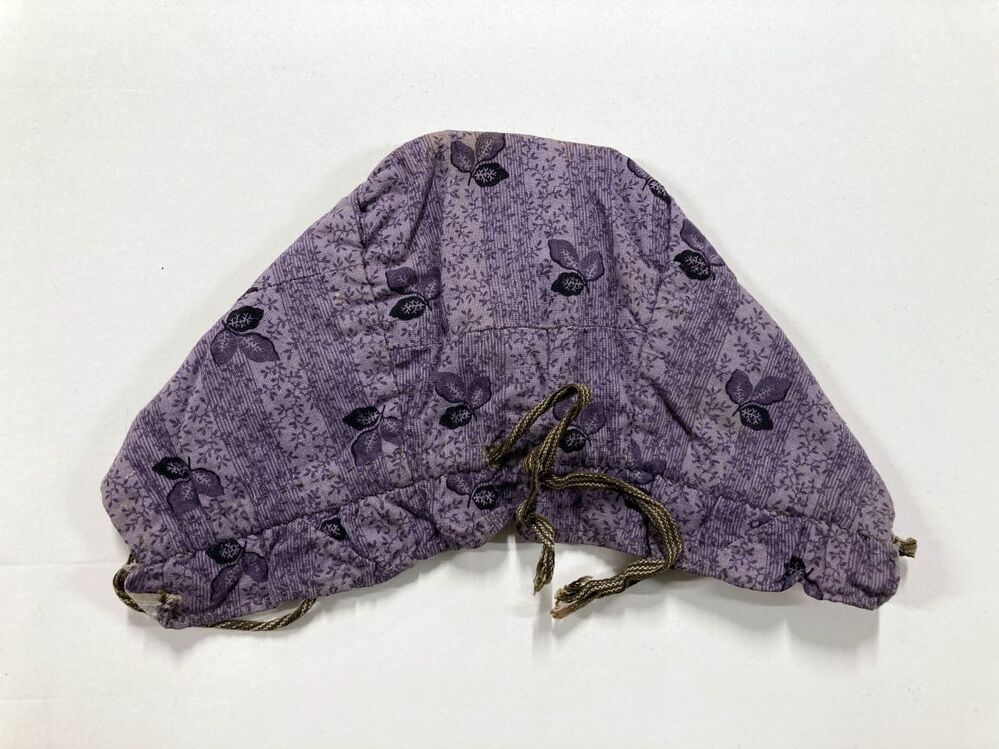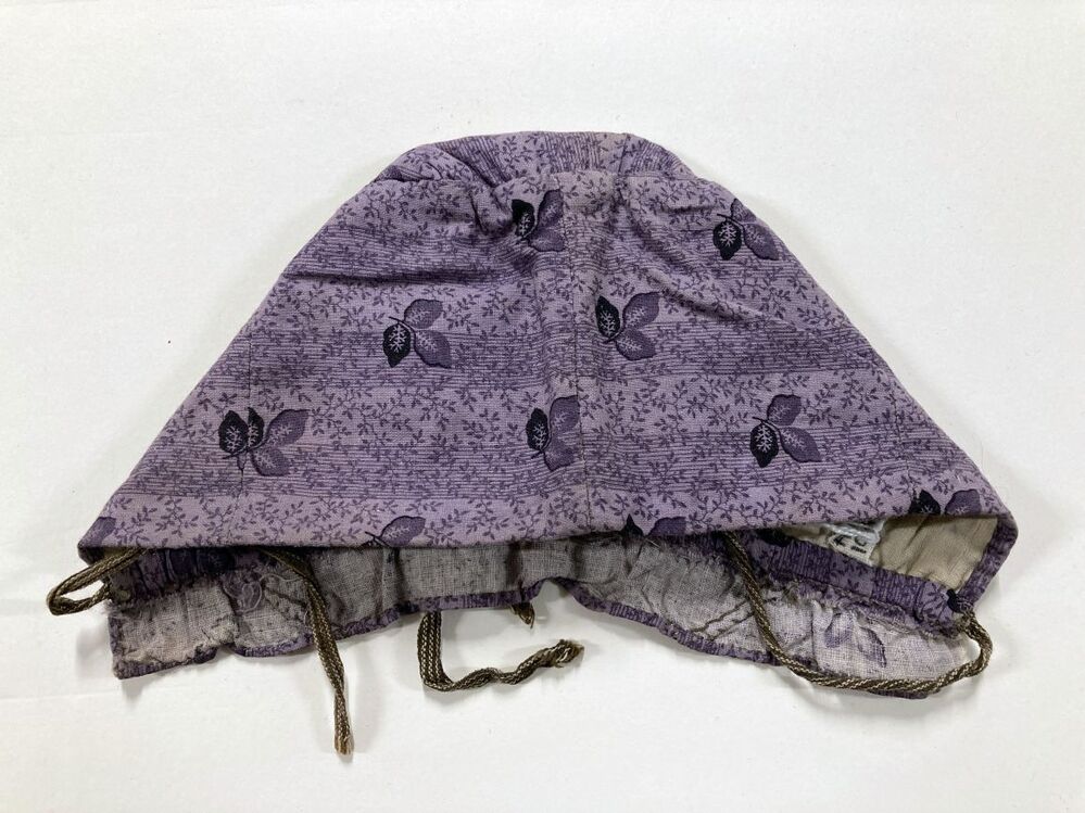 Kindermutsje van lichtpaars bedrukt katoen met enkele donkerpaarse bloempjes