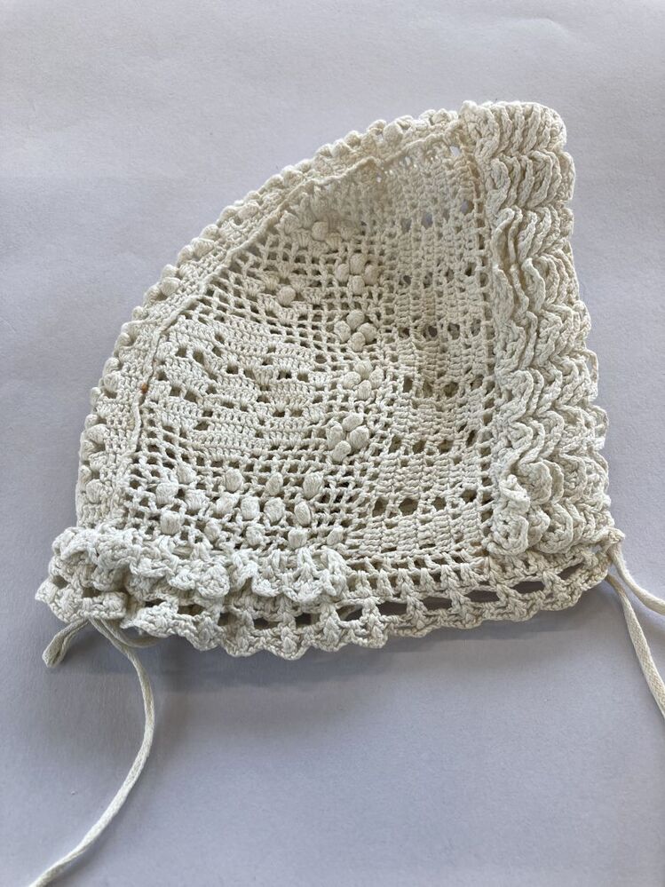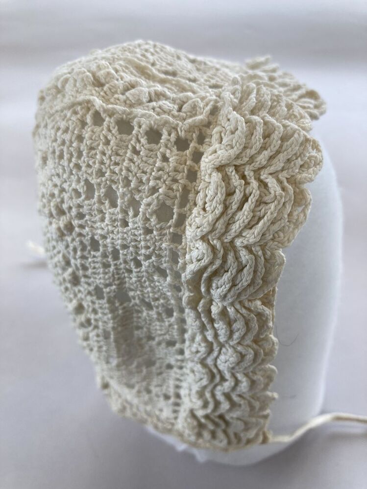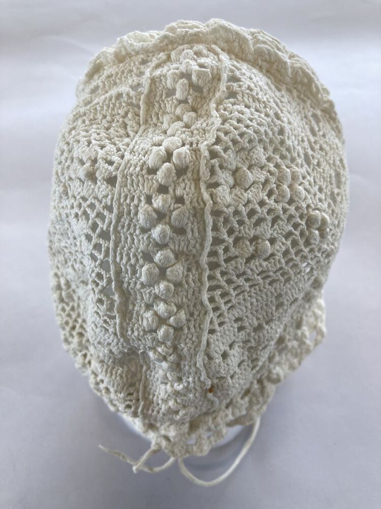 Wit katoenen gehaakte meisjesmuts met nopjes en zes geschulpte stroken langs het gezicht.