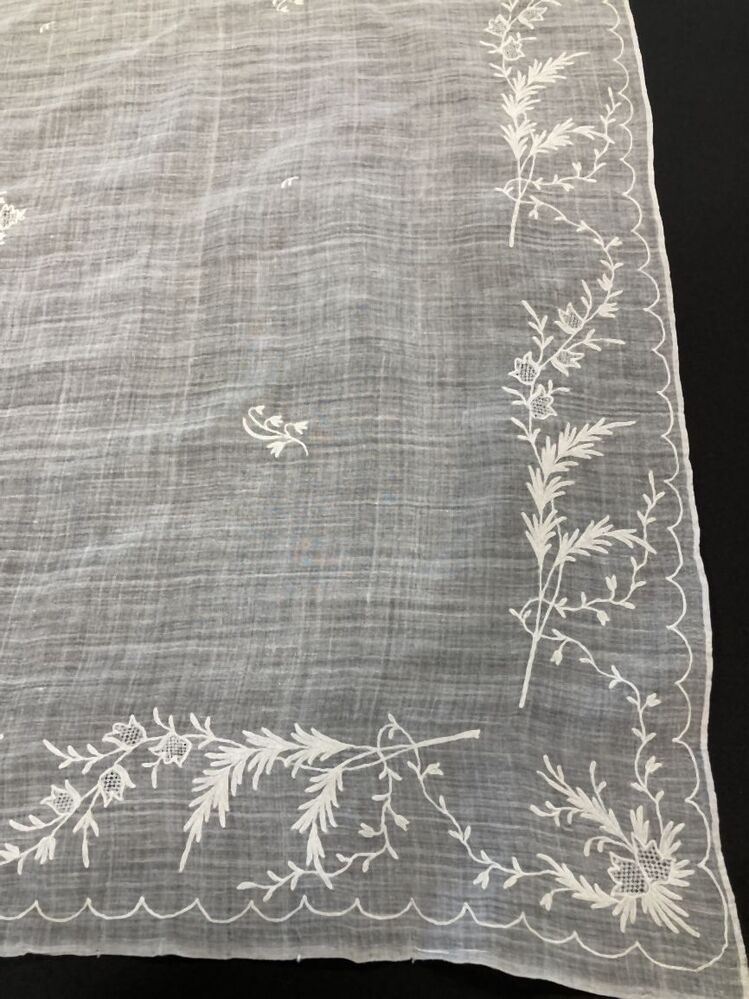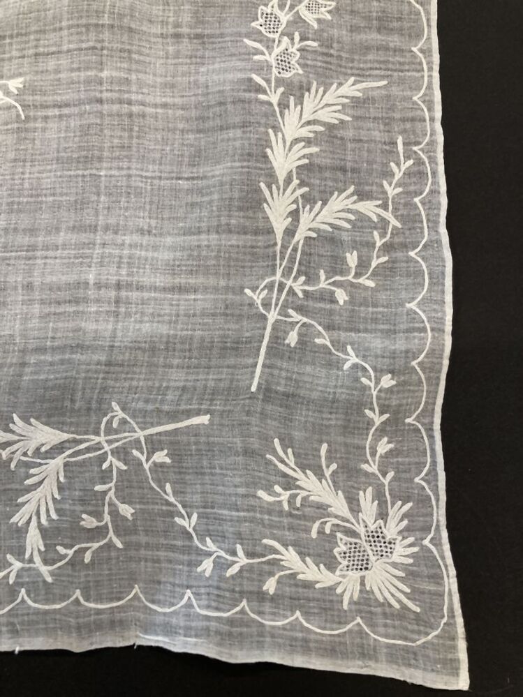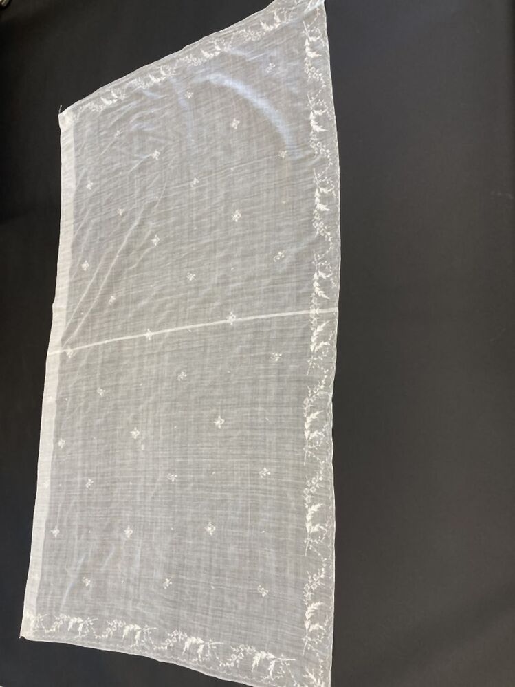 Breed wit schort van neteldoek, versierd met takken-rand in tamboereerwerk