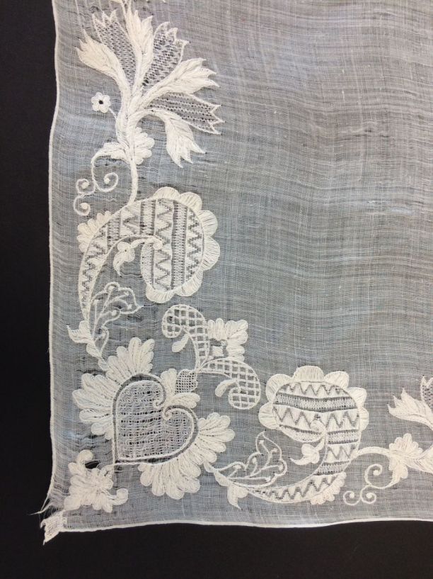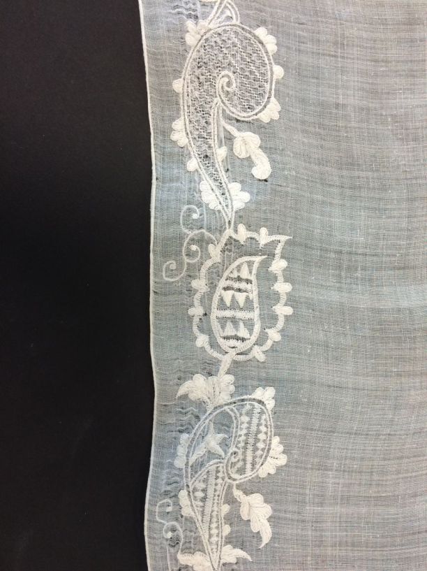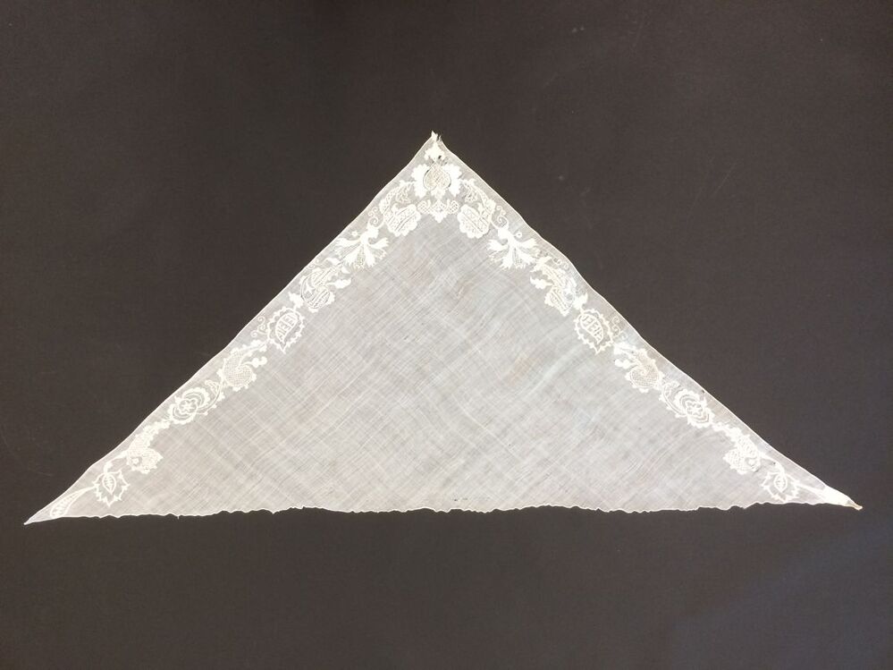 Wit neteldoek fichu, versierd met rand van bloemranken van naaldwerk