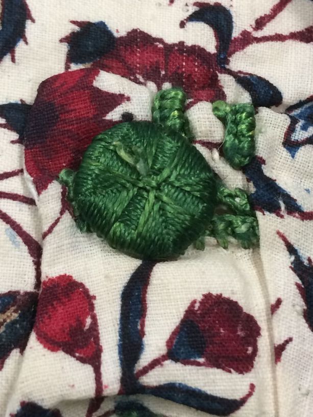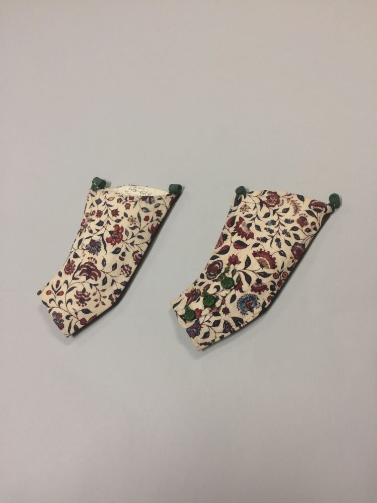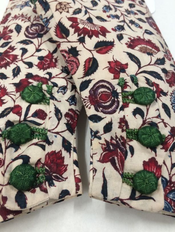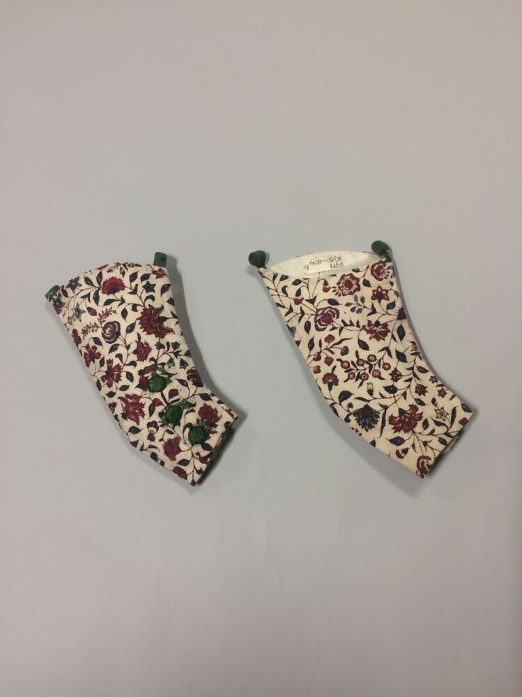 Sitsen kindermouwtjes, met krullende rode stengels, kleine bloemetjes en blaadjes op witte grond