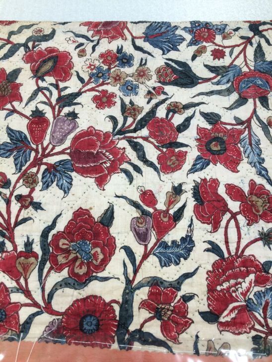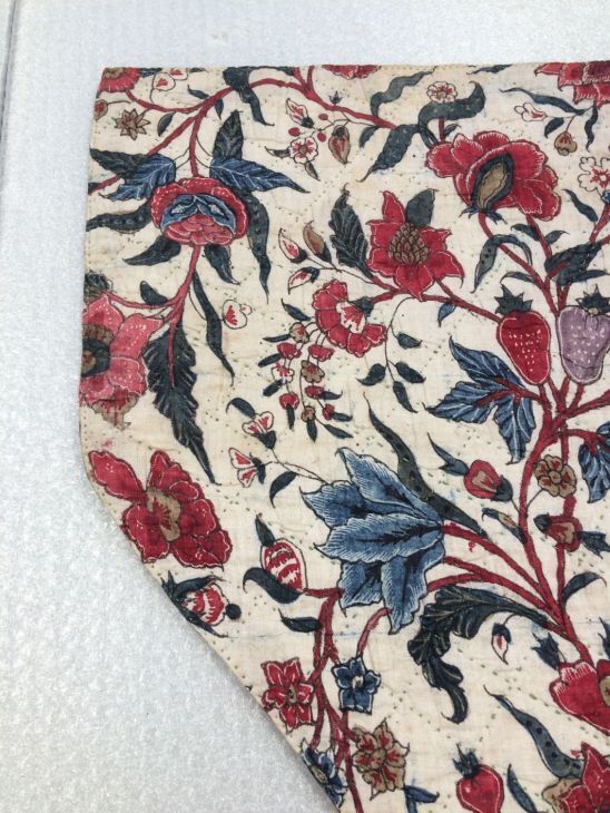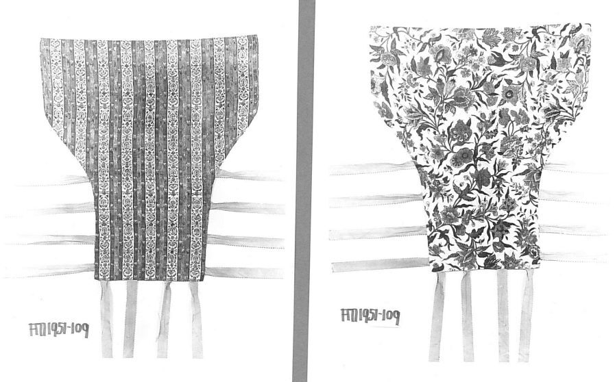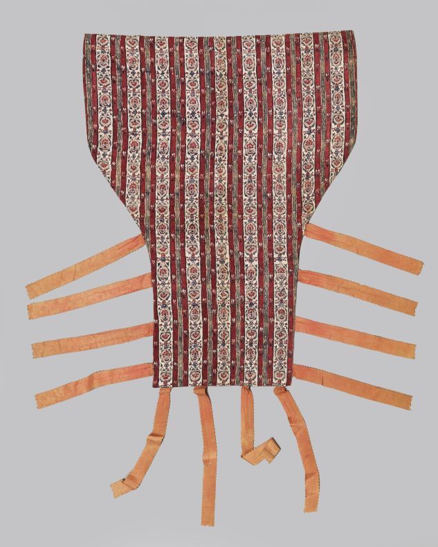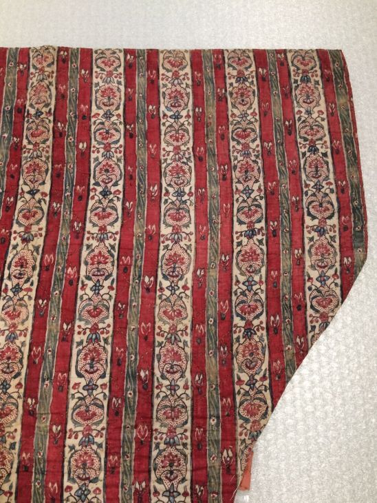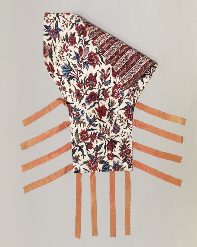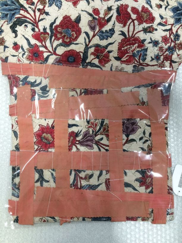 Sitsen wikkelkleed voor baby, met roze linten van twee verschillende sitsen, een met bewerkte strepen, de andere zijde met slingerende bloemenranken op witte grond