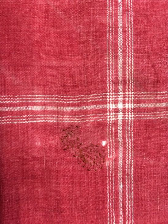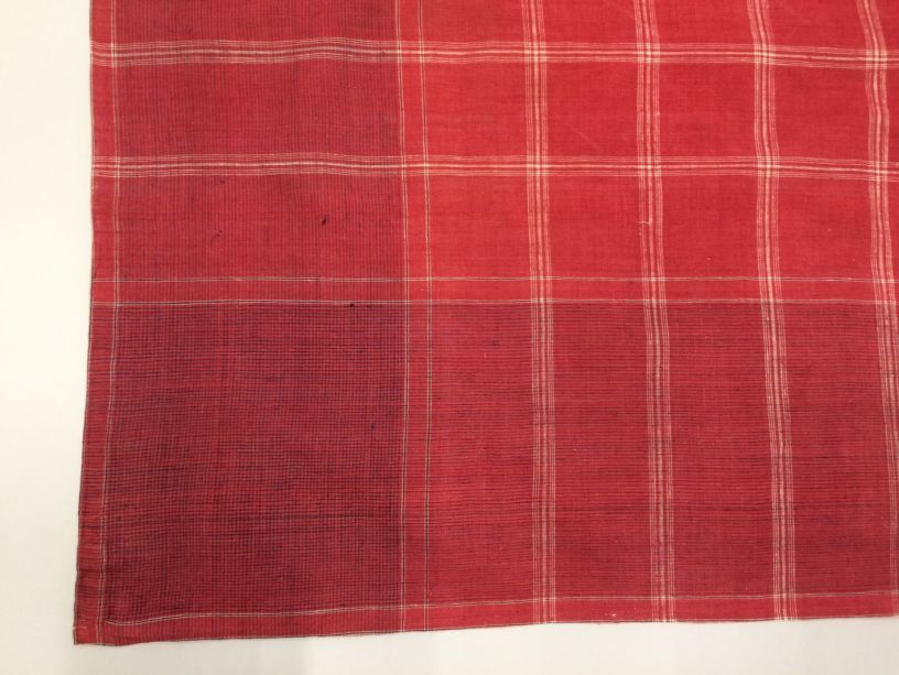 Hindelooper sondook met ingeweven ruit, rode grond, met grote witte ruiten en rand 'lapkede' met blauw
