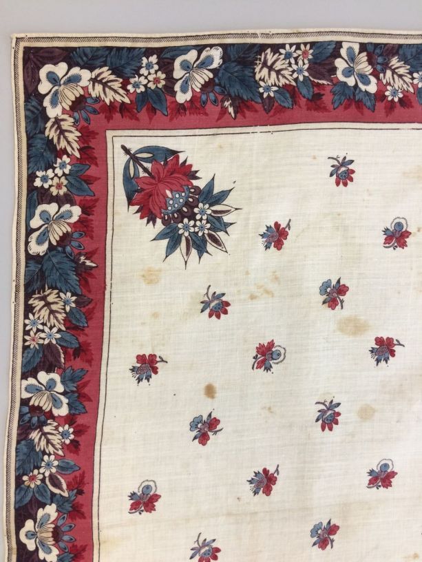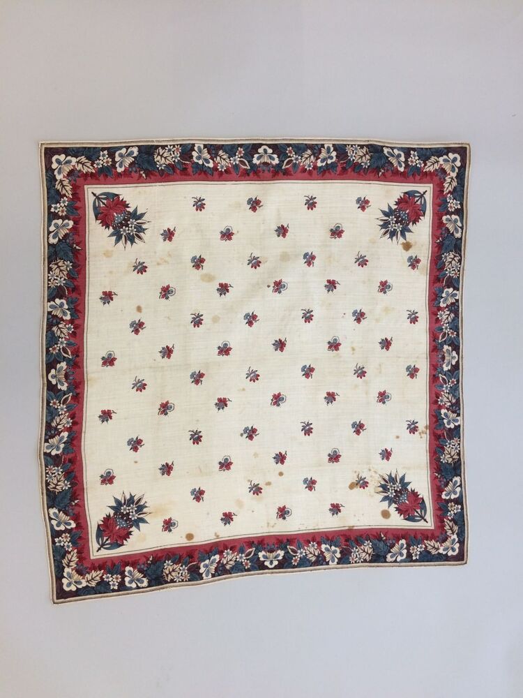 Vierkante in sitstechniek bedrukt katoenen doek of sjaal met wit middenveld met strooimotief en boeketjes in de hoeken en gebloemde rand