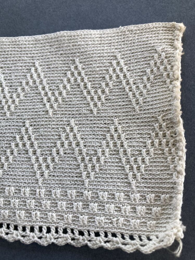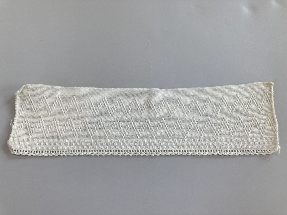 Tipmutsstrook van reliefhaakwerk in wit katoen, in zigzagpatroon. , met open randje en picootje langs de zoom
