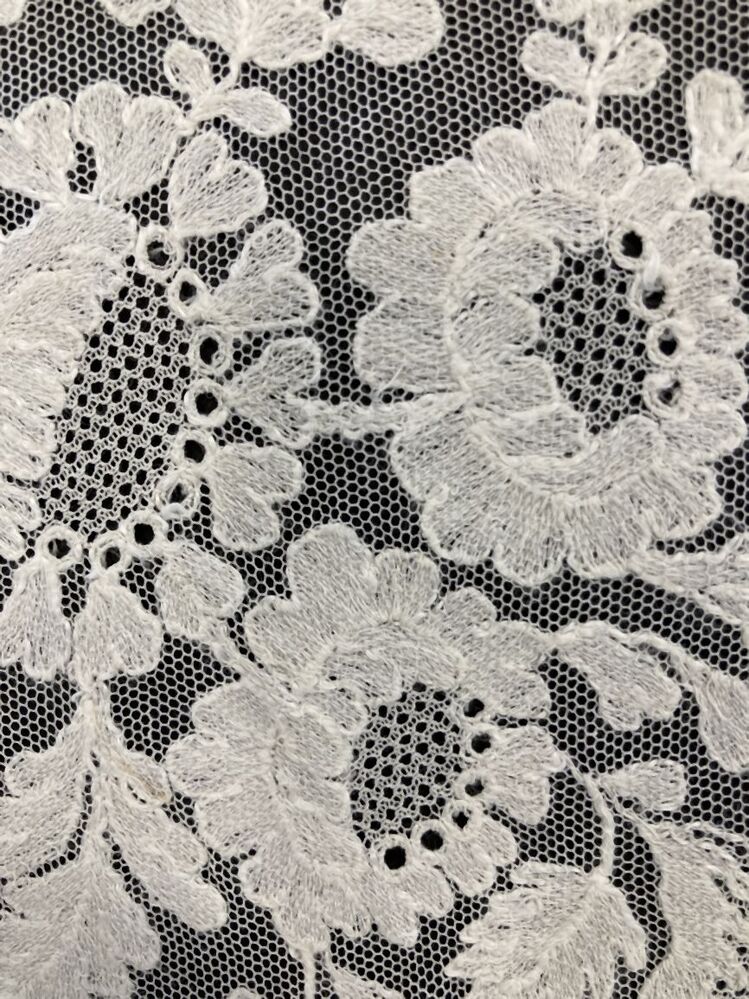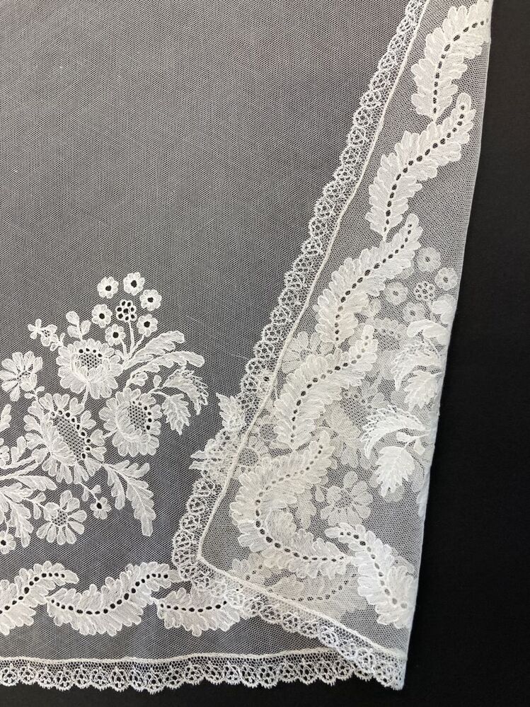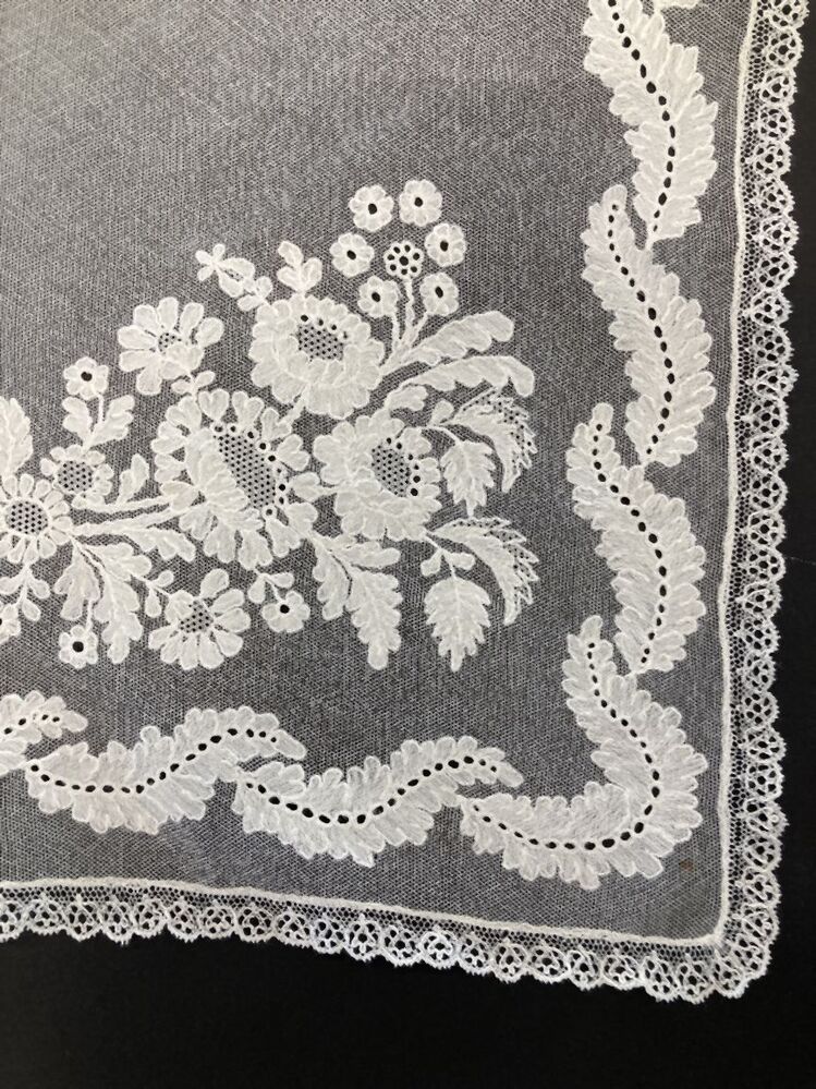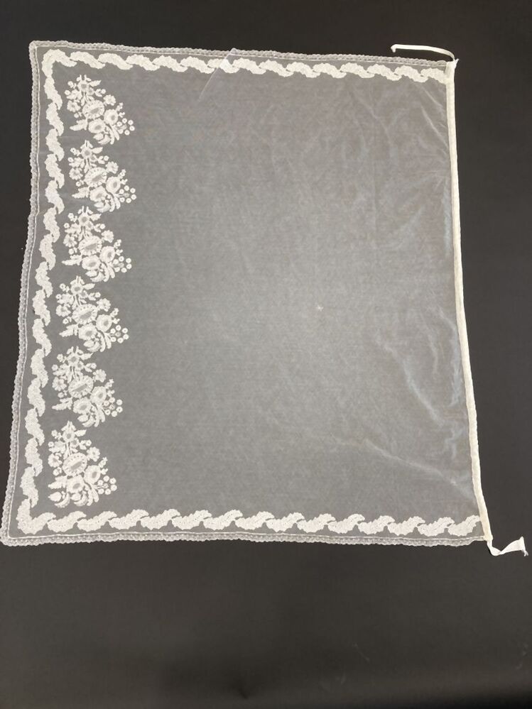 Tulen schort met kantrand, de onderzoom versierd met groot bloempatroon, de zijkanten met bladmotief