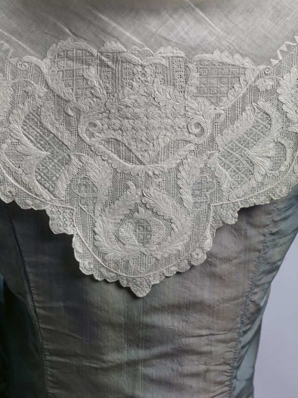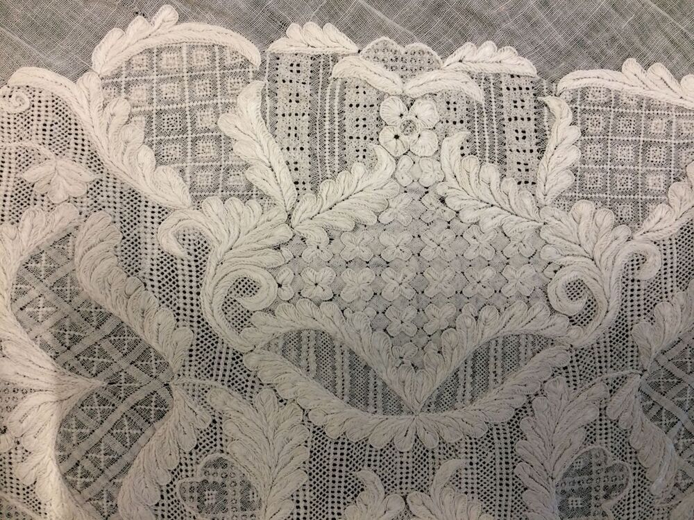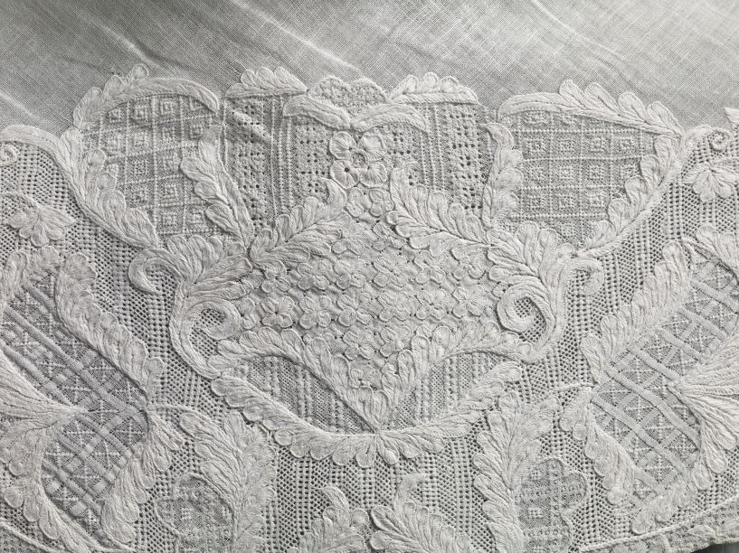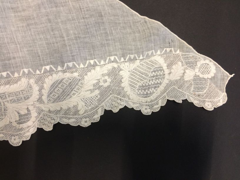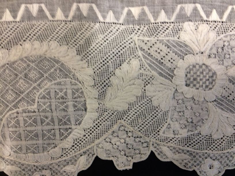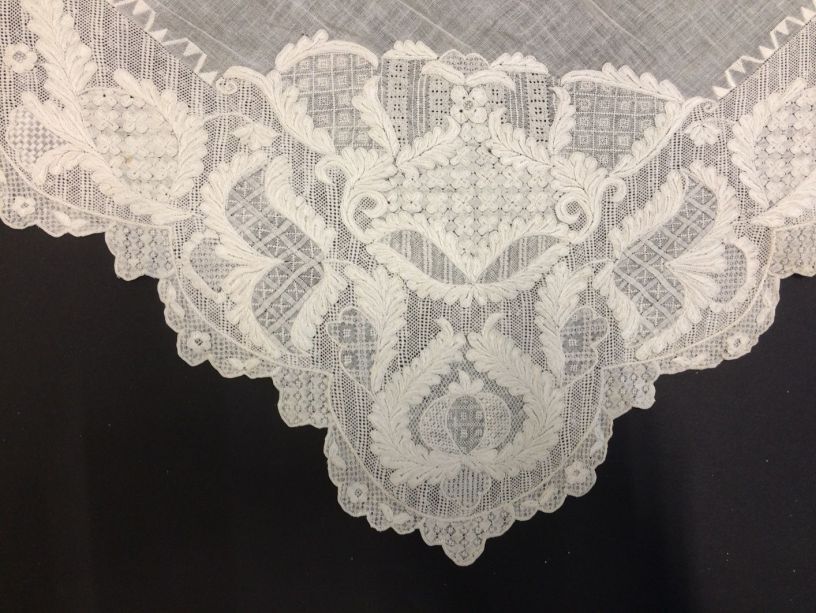 Fichu of tipdoek van wit neteldoek met geschulpte rand en brede rand van borduurwerk in point clair