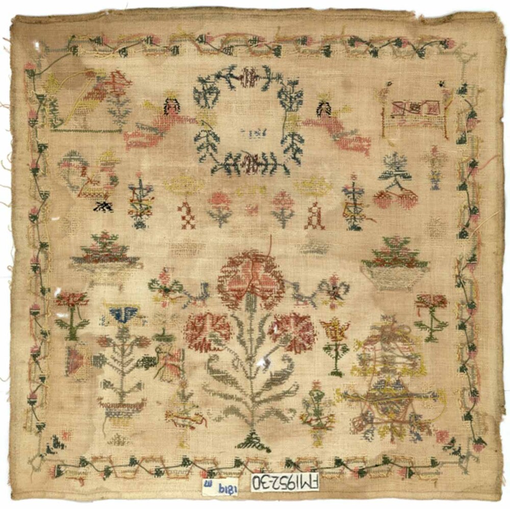 Textielwerken, meestal van fijne stof, waarop door vrouwen en meisjes in verschillende steken is geborduurd en die bedoeld zijn om in te lijsten. Ze werden doorgaans gemaakt door beginnelingen om hun vaardigheden te tonen. Kenmerkend zijn een combinatie van steken, motieven, letters en verzen, en vaak de voltooiingsdatum en de naam van de borduurster. (AAT-Ned) https://data.cultureelerfgoed.nl/term/id/cht/9af3e18e-7bc8-40d2-87ca-8eef2dfe2bc3